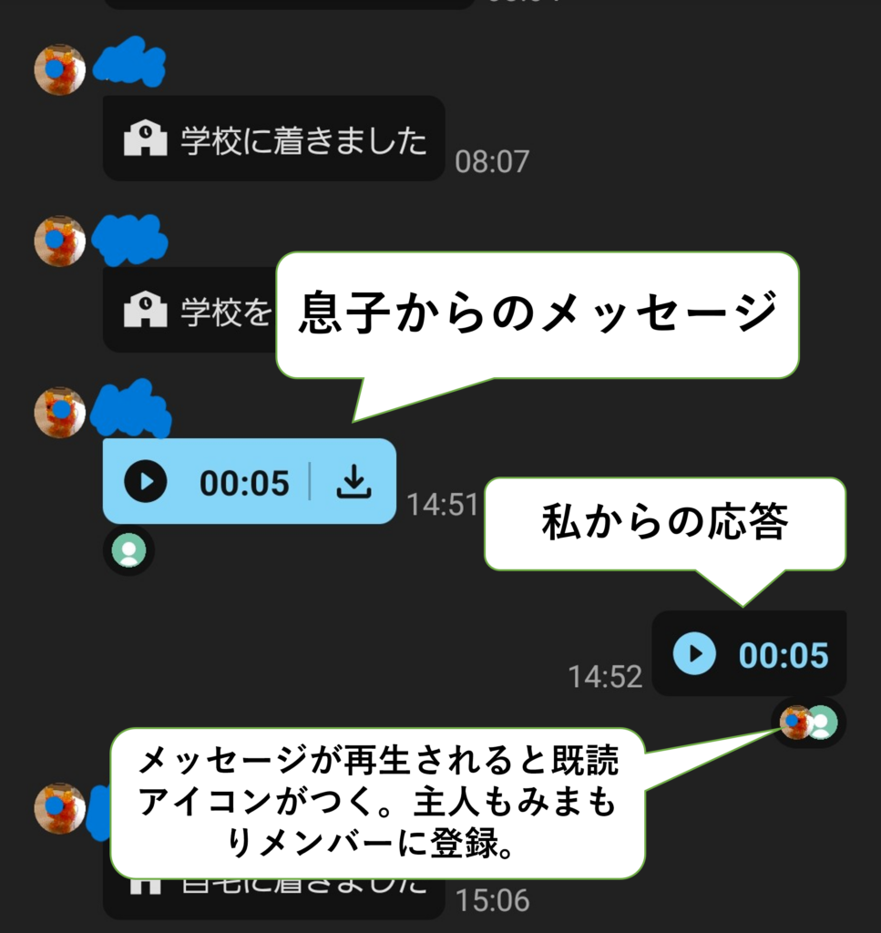 メッセージのやり取りはGPSの管理画面で確認ができ、親側が送ったメッセージが子ども側の端末で再生されると、既読マークがつくのは非常に便利。