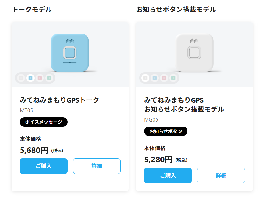 2025年12月現在、みてねみまもりGPSの公式サイトで販売されている端末は2種類。