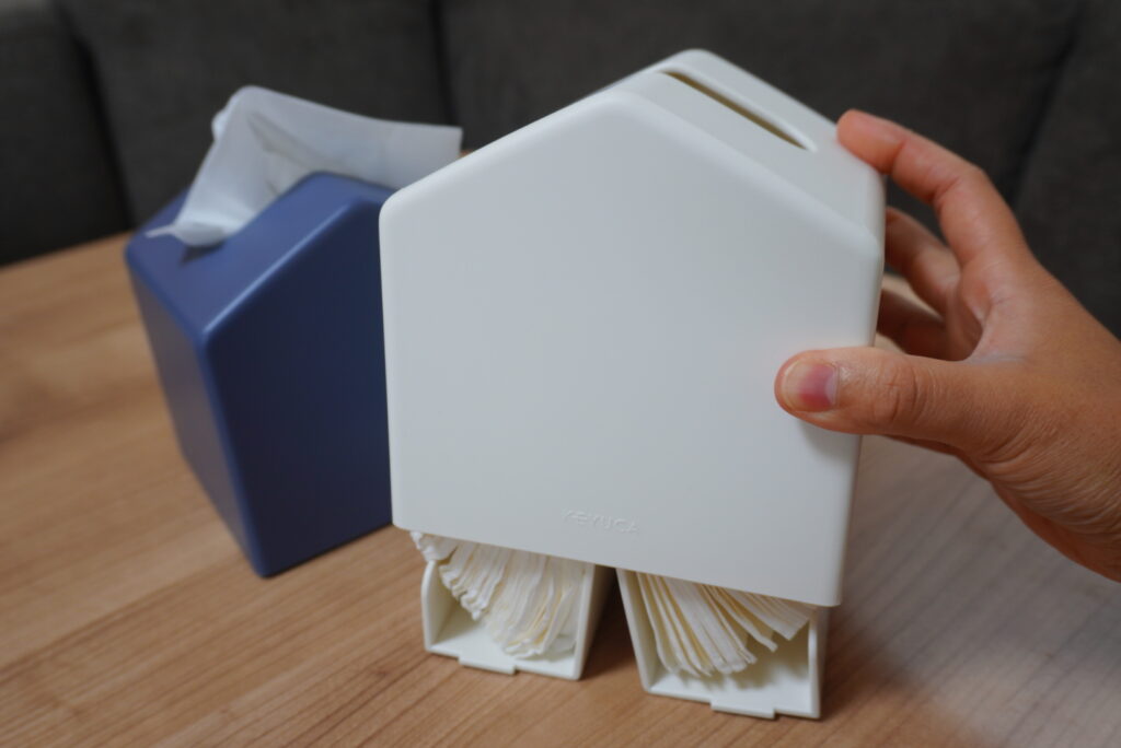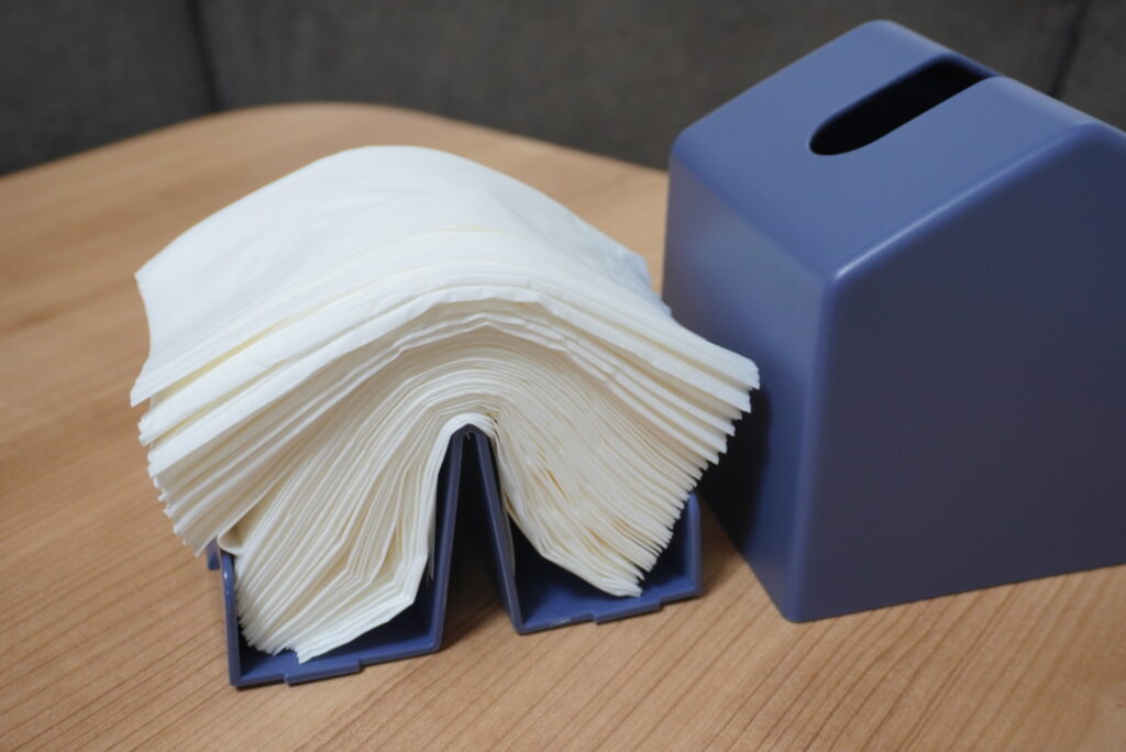 ティッシュペーパーを二つ折りにすることで省スペースを実現したこの商品。