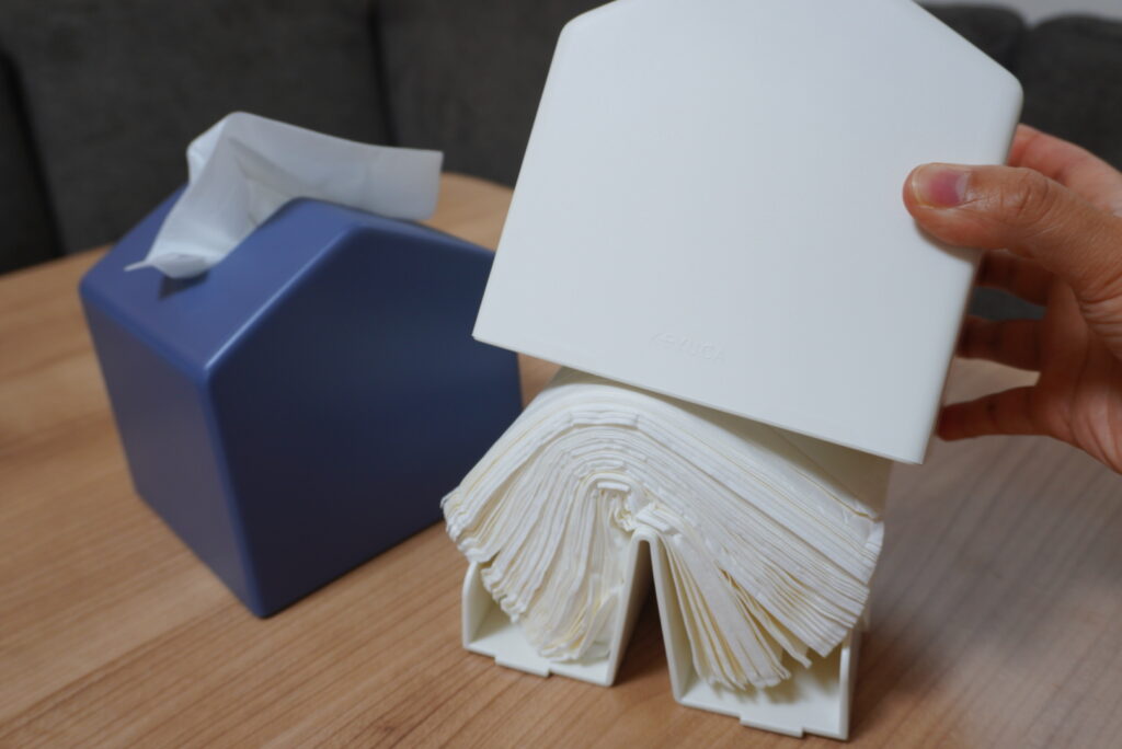 というのも、公式サイトの説明では「一般的なティッシュボックス(厚み約40~50mm)」を想定した造りとあり、これはよくある2枚重ねのものでおおよそ150~200組のティッシュペーパに該当します。