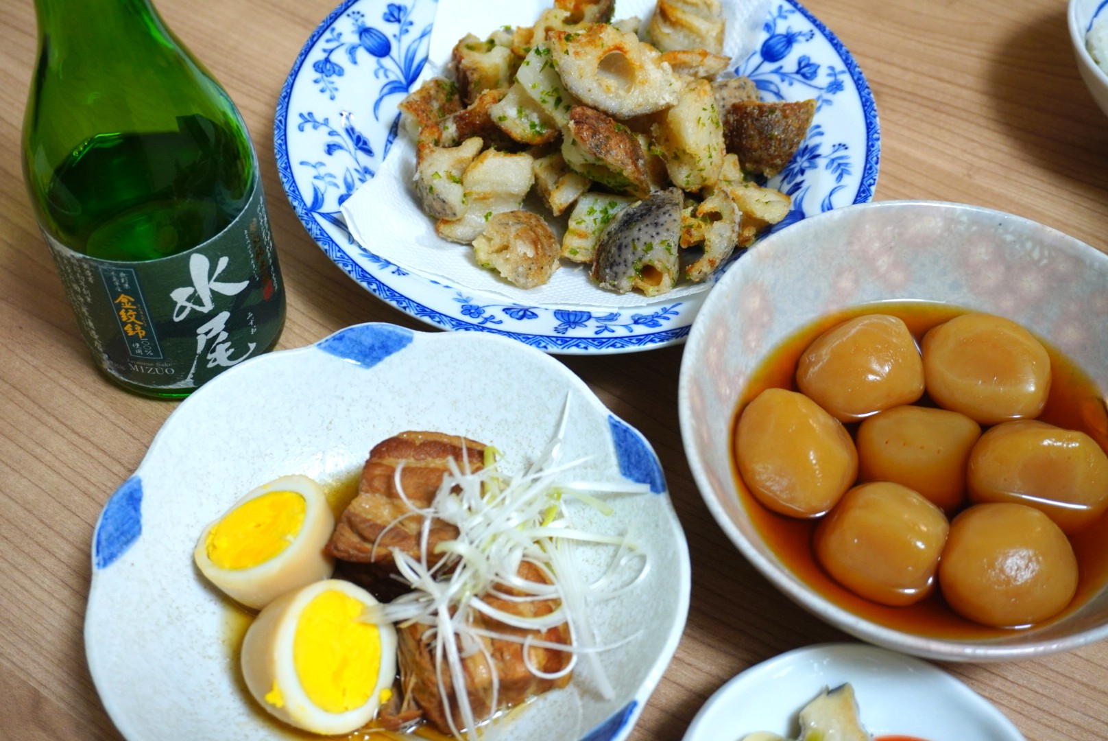 食感にバラエティーを持たせたいなと思い、玉こんにゃくとレンコンの唐揚げを用意してみました。右下チラッとみえている漬物は、我が家では日本酒を楽しむときに必須のわさび漬け!