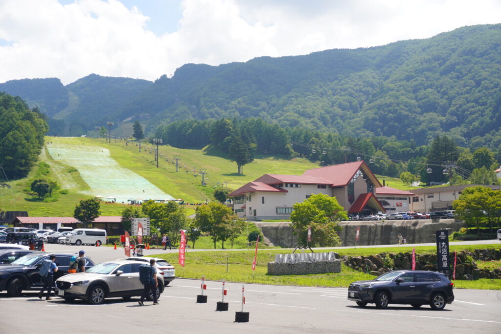 関越交通バスに乗り、日光白根山ロープウェイバス停到着は10:57頃。バスを降りるとすぐ目の前にスキー場の爽やかなグリーンが目に飛び込んできます。