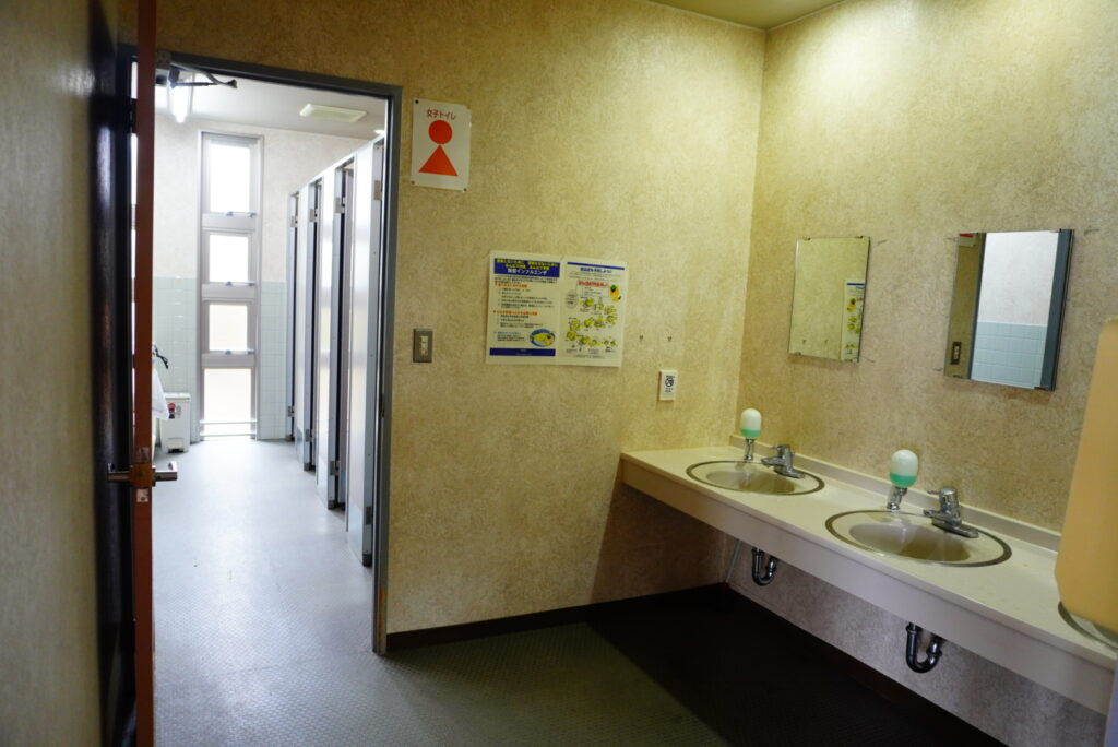 ①レストランしらね 正面入口のドアは夜間も施錠されず、トイレ・洗面所・自動販売機が使えます。水場もあり。