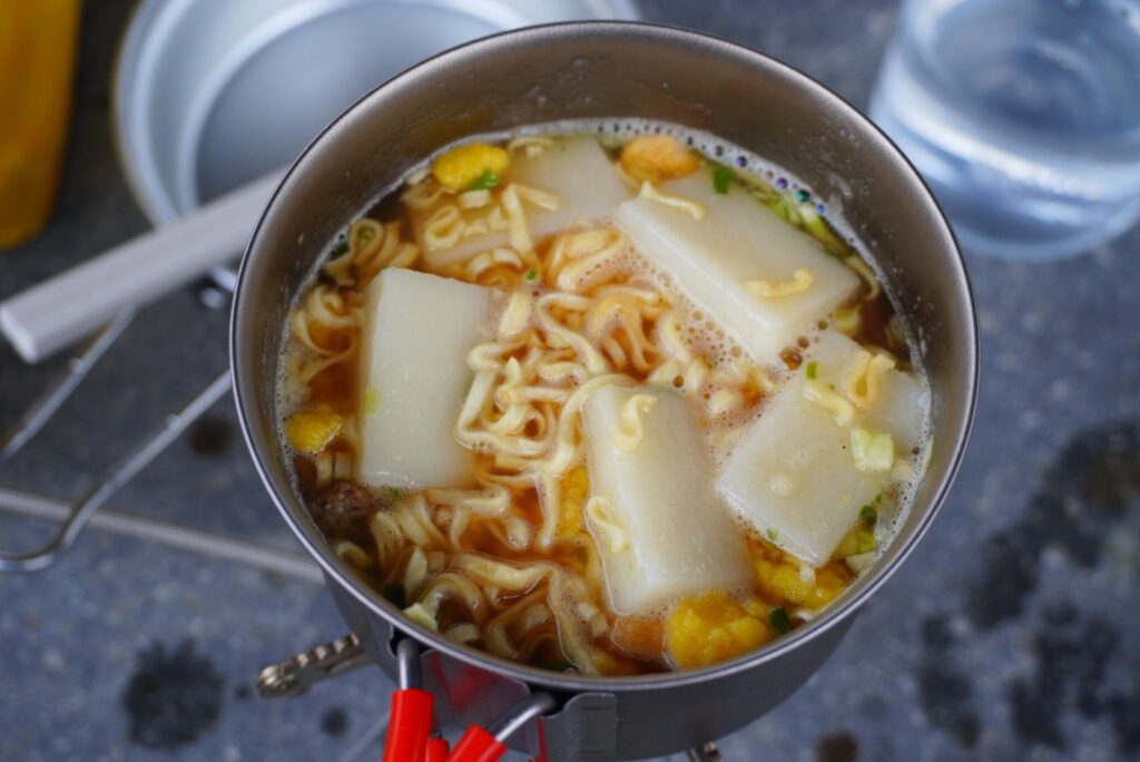 朝食は、いつものラーメン餅。作り方は、2023年はじめてのテント泊ごはん記録/紅葉の三条の湯テント泊に詳細があります。