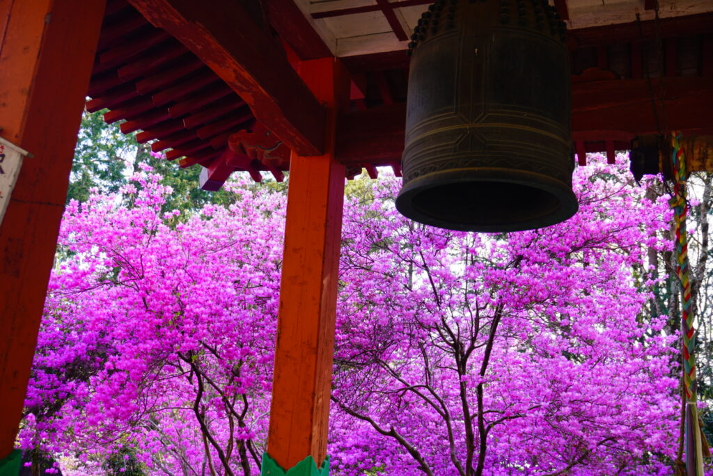 濃いピンクとも薄紫色ともいえる花の色が境内を染め上げているようで、とても幻想的な空間でした。