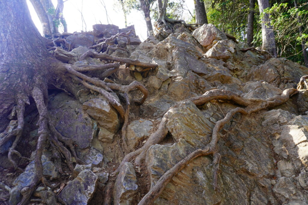 山頂直下は、岩や根っこがむき出しの急登です。慎重に。